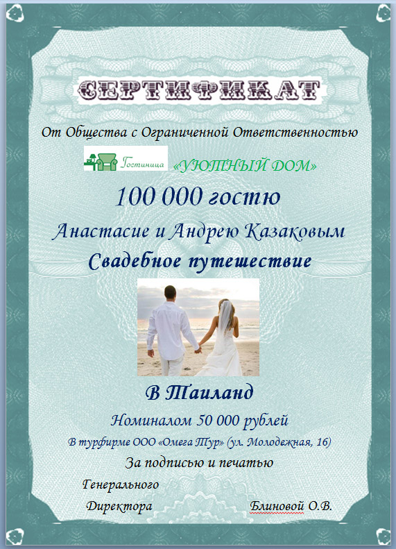 – Мы взяли курс на совершенство, повышение качества сервиса, расширение спектра предлагаемых услуг, – сказала Ольга Валерьевна, – Подарок юбилейному посетителю – свадебный тур заграницу – не разовая рекламная акция «Уютного Дома», и не первый сертификат. На протяжении всех этих лет гостиница «Уютный Дом» плодотворно сотрудничает с турфирмой ООО «Омега Тур», предоставляющей ряд выгодных предложений в плане туристических поездок по всему миру.
