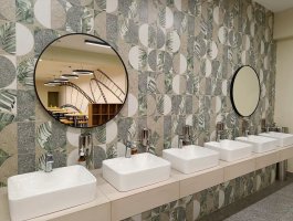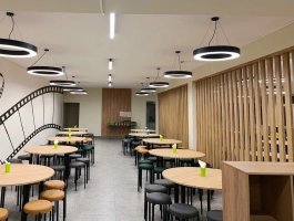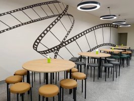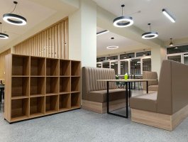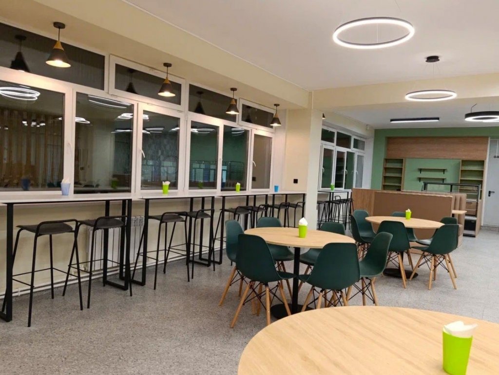 Это помещение — самое просторное среди всех школ города. Для него разработали уникальный дизайн и реализовали несколько полезных решений. Например, установили специальные шкафчики для рюкзаков, чтобы они не мешали ученикам во время обеда.